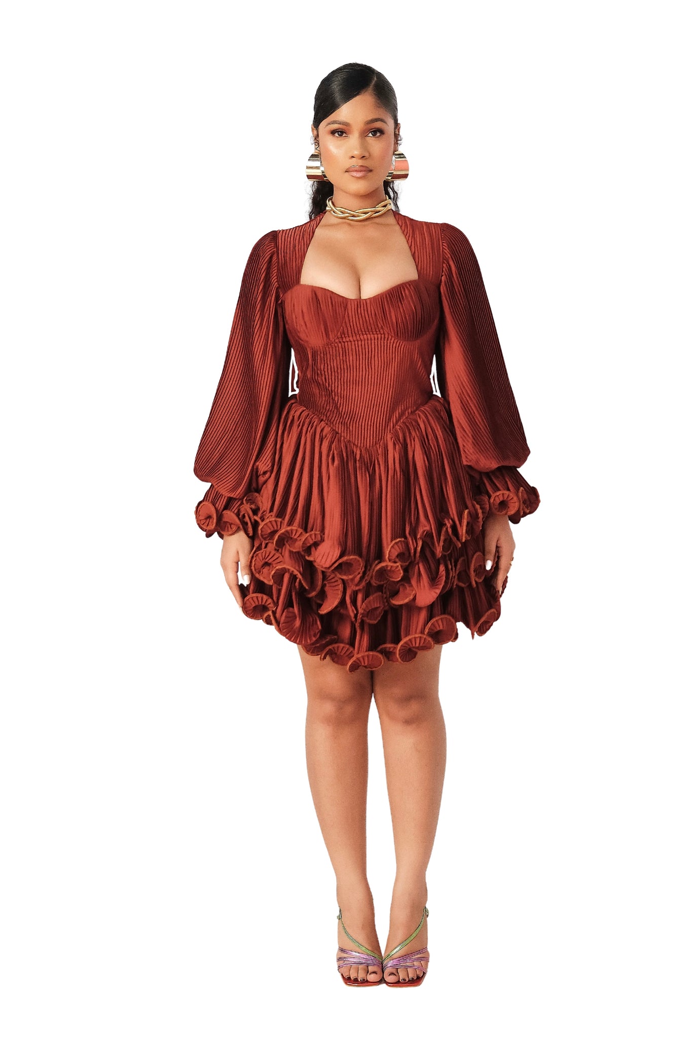 Elora is crafted from the finest luxurious plisse fabric; featuring a milkmaid neckline/bustier, with a spiral triple-step tropical flounce.